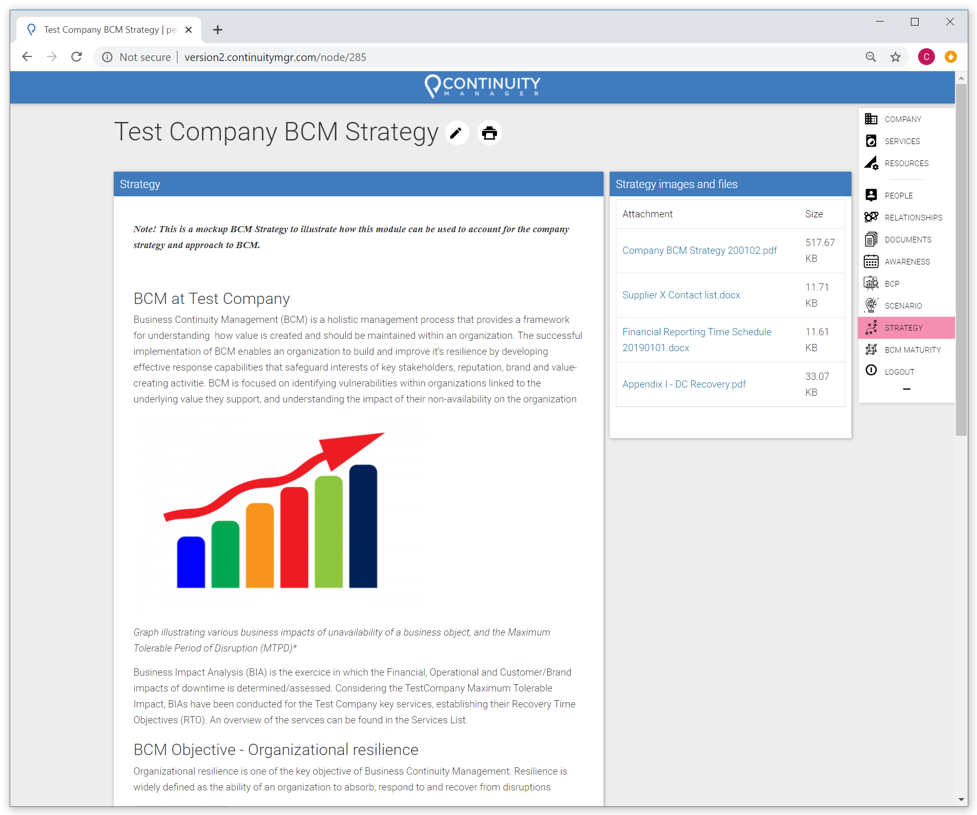 Presentation of the overall company/organization strategy and approach to BCM. Create and present content and enclose key document and instructions to be readily available to the organization and provide context for the overall BCM effort.