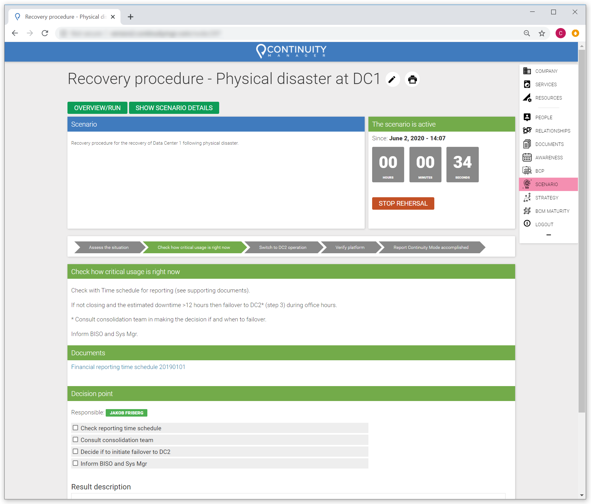 Dra nytta av information från andra delar av Continuity Manager och lyft interaktivt in information om kritikalitet, kristeam, status på tjänster eller resurser eller länka in fördefinierade rutiner från Reharsal/Execution modulen. Live-BCP som alltid har den senaste statusen och informationen från övriga moduler i systemet. Generera snapshots och skapa PDF-versioner med godkännandefunktion för att generera offline versioner av planer.