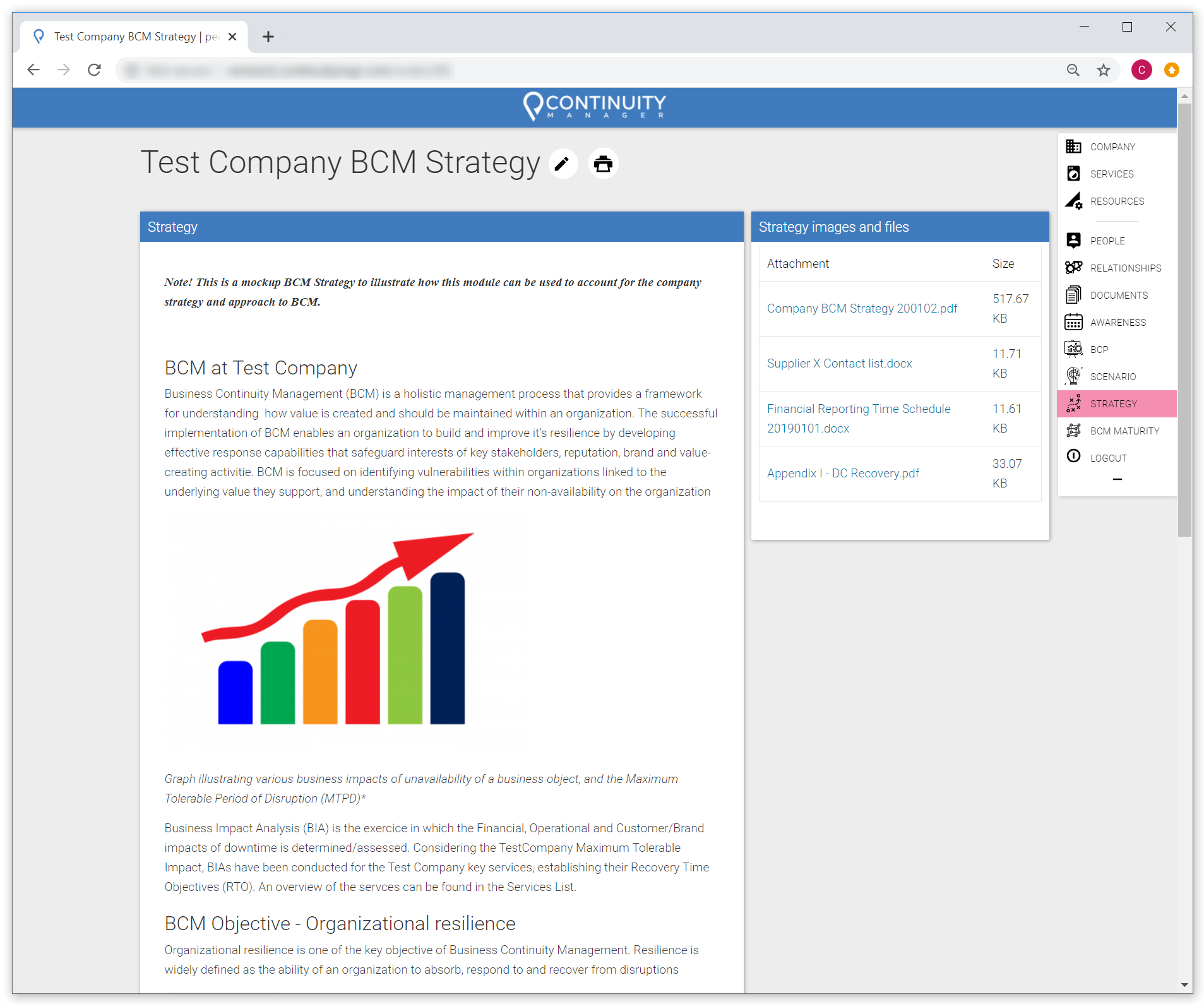 Skapa och samla övergripande information runt BCM strategi, bifoga nyckeldokument och instruktioner så att detta är tillgängligt för organisationen och ger en kontext till BCM arbetet och övriga moduler.